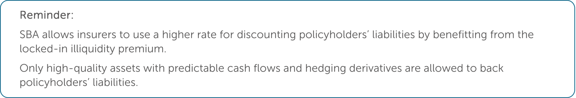 The principle behind the SBA is to allow insurers to discount liabilities with the yield of their investment portfolio. It is accepted that insurers can take advantage of the illiquidity premium locked in in their assets, but the spreads should be adjusted for the default and downgrade (D&D) costs.