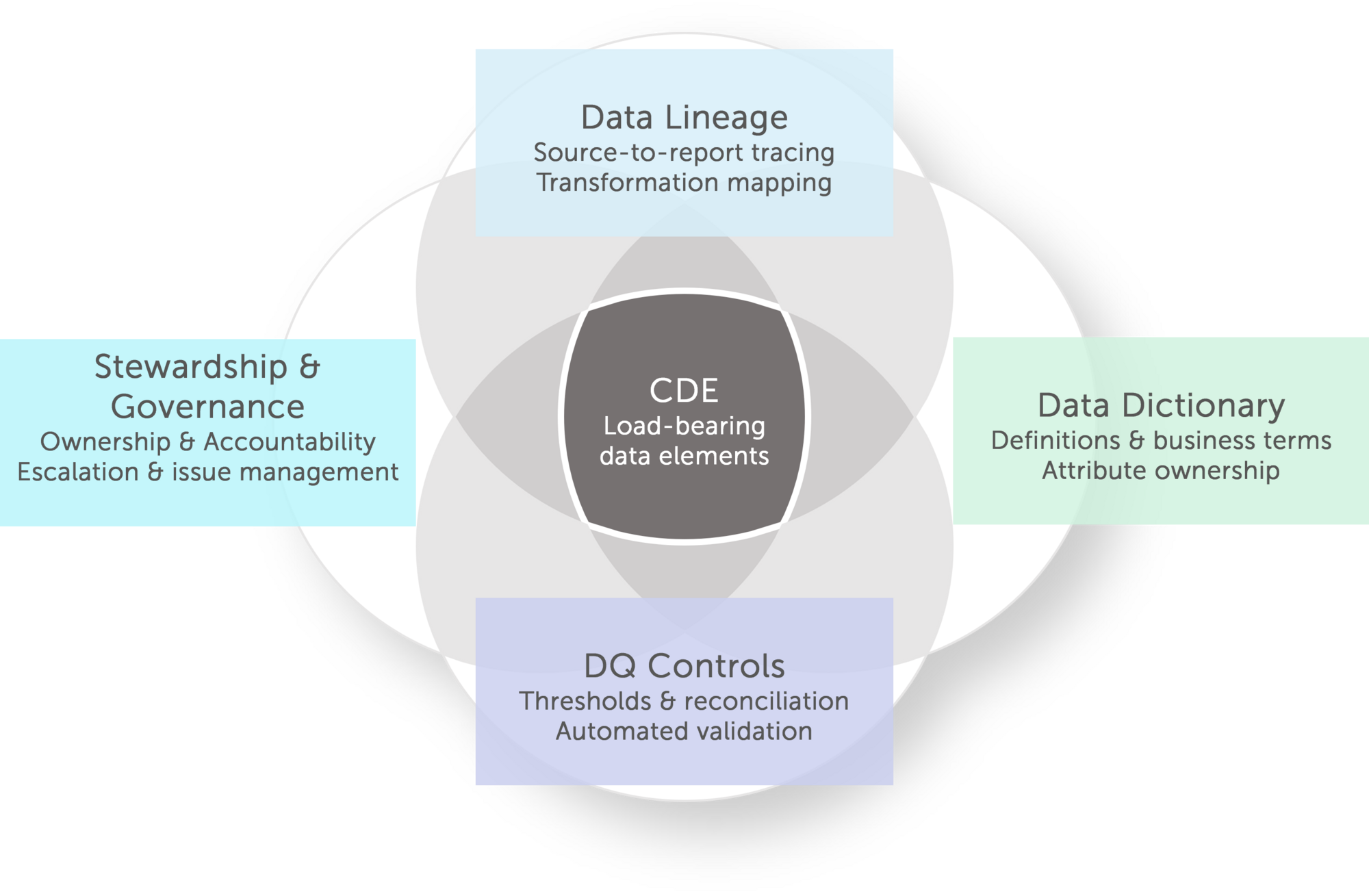 What makes CDEs operationally powerful is that they force each discipline to deliver precisely. Lineage without CDE prioritisation produces comprehensive maps nobody acts on. DQ controls without CDE materiality thresholds generate noise rather than signal. Stewardship without named accountability for specific elements -an identified owner for Exposure at Default, a defined remediation SLA, board-level visibility when thresholds breach- remains a governance policy on paper. CDEs convert each discipline from a programme of record into a working control. That is why they sit at the centre of the diagram: not as an artefact to be catalogued, but as the intersection where definition, traceability, quality, and accountability become mutually reinforcing