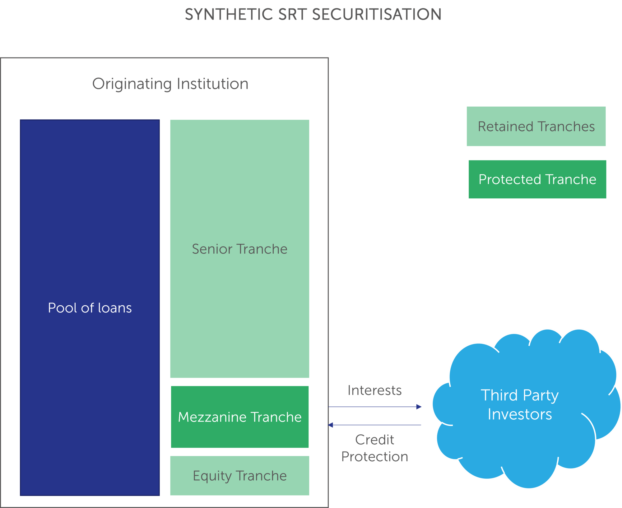 Similar to other forms of securitisation, SRT transactions involve pooling financial assets and structuring the resulting portfolio into several tranches with varying levels of seniority and risk. Some or all of these tranches are then placed with investors such as insurance companies, asset managers, or other banks seeking new sources of yield and greater portfolio diversification across asset classes or geographies that would otherwise be difficult to access.