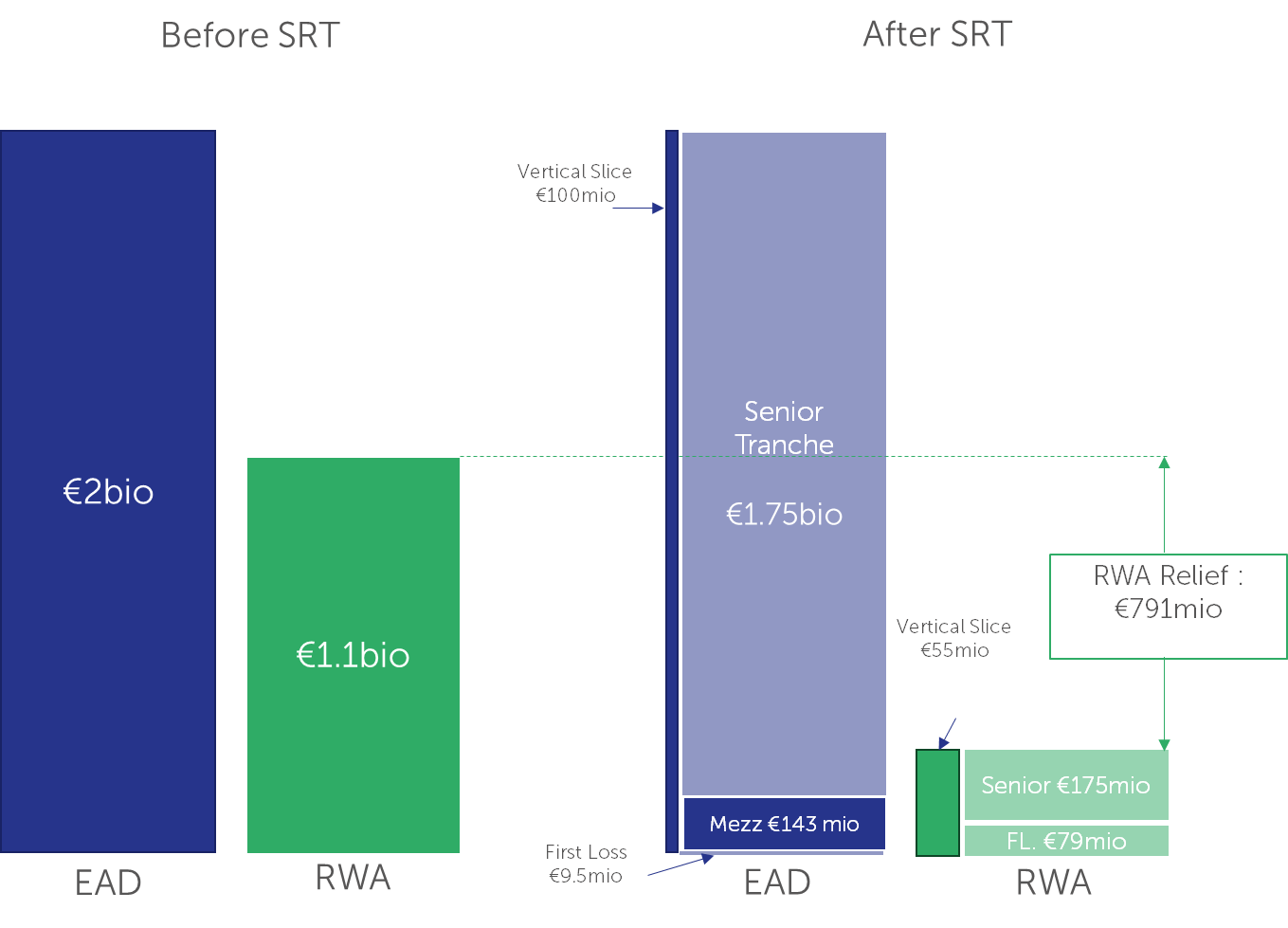 Thanks to this SRT transaction Bank A benefits from a €791 million RWA relief.