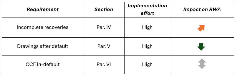 The new EBA formula changes the treatment of additional drawn amounts considerably, often resulting in a significant reduction depending on the timing of post-default drawings and recoveries. Consequently, it is expected to decrease the RWA for portfolios with substantial post-default drawings and will necessitate major updates to the CCF models currently used by banks. Furthermore, including post-default drawings within the LGD may be more beneficial, as LGD floors limit the potential reduction in capital if these drawings are accounted for in the CCF.