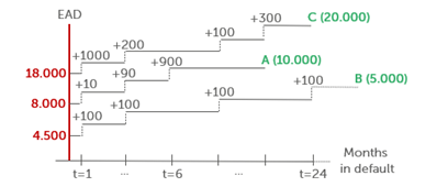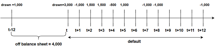 Let’s suppose again that 12 months before the default the drawn amount is €1K and the undrawn amount €4K. The amount drawn at default is €3K, the discount rate 5% and the post default drawings (positive amounts) and recoveries (negative amounts) are the following stream of cash flows: