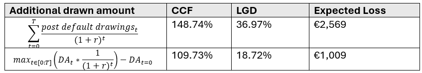 With the former formula (discounted sum of post default drawings), the additional drawn amount is €3,945.5. With the new formula, it becomes €2,389.3. We get the following parameters for the two formulae: