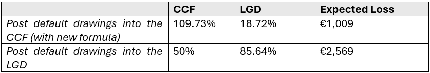 Under the new regulation, additional drawings and recoveries are no longer fully reflected in the CCF, as the modelling now relies on the maximum drawn amount. As a result, the treatment of post-default drawings leads to different expected loss outcomes depending on the LGD’s position relative to its regulatory floor (e.g. 15% for revolving retail exposures secured by commercial immovable property).