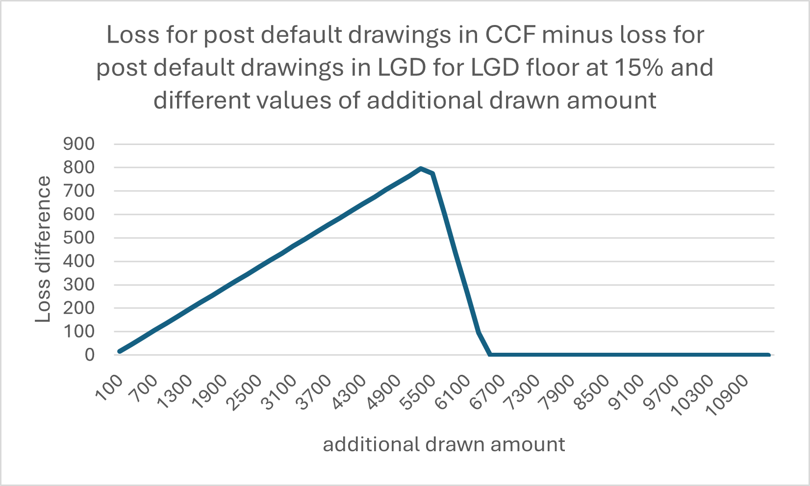 By applying the 15% LGD floor for other retail exposures secured by other physical collateral, we get the different levels of expected losses when including the post default drawings into the LGD or into the CCF. Such floor is in practice applied at the LGD estimate level (i.e., calibration level), but here in our simplifying example there is only one exposure so we apply it at the exposure level. Continuing with our illustrative example, we can see that changing the post-default drawing amount will change the difference in measured loss between including it into the CCF and into the LGD. This loss difference relation is non-linear and becomes 0 as the LGD without including the post default drawings exceed the 15% threshold: